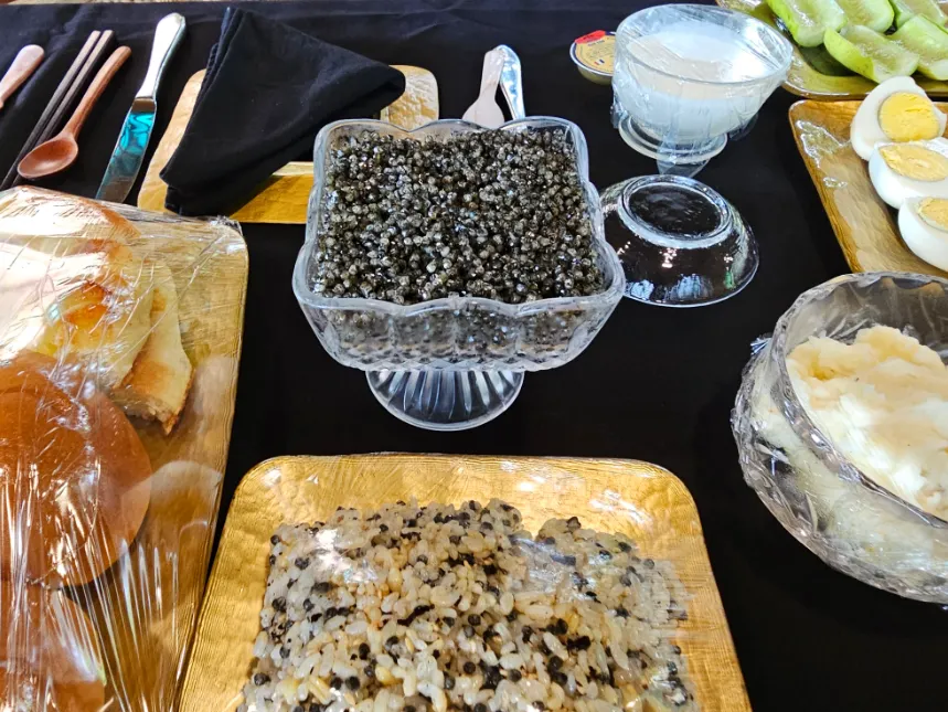 캐비어가 비싼 이유는 철갑상어를 최소 10년 동안 키워야 첫 캐비어를 얻을 수 있어서라고 합니다. 또 일반적인 수입 캐비어는 염색을 거치지만, ㅇ캐비어는 천일염 외의 방부제 등을 사용하지 않았다고 해요. 캐비어를 여러 각도에서 볼 때마다 오묘하게 색이 다르게 보여서 신기했습니다.